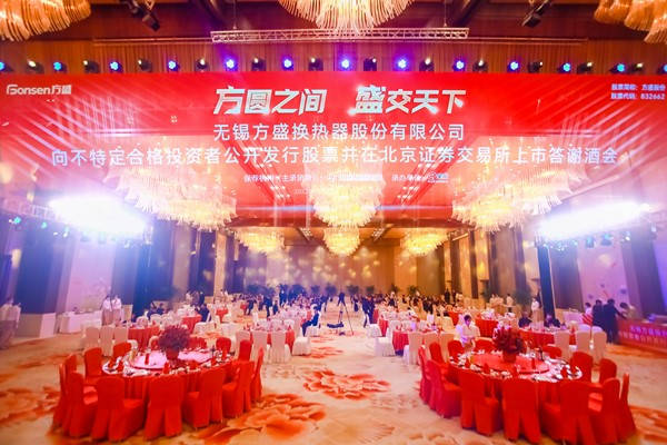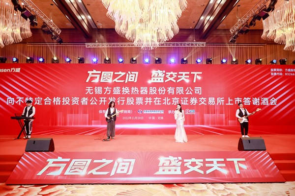 2022年11月28日,无锡方盛换热器股份有限公司北交所上市仪式和答谢会顺利举行。本次上市仪式以云敲钟的形式举行,无锡市人大常务委员会副主任袁飞,滨湖区区委书记孙海东,华英证券总裁王世平,方盛股份董事长、总经理丁云龙出席仪式并分别致辞。无锡市行政审批局局长蒋群联,无锡市地方金融监管局局长顾伟,无锡市发展改革委副主任杨晓妮,无锡市工业和信息化局副局长张国斌,滨湖区领导高扬、赵华,无锡市上市公司协会会长万冠清,方盛股份党支部书记、董事丁振芳,以及丁振红、张卫锋、孙耀春和王平等董事高管人员出席上市仪式。